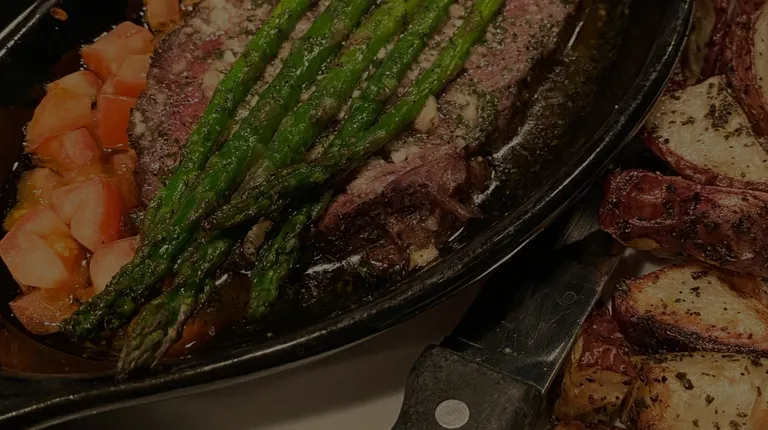 Bourbon bacon glazed Salmon with lemon and herb asparagus and a side of mushroom risotto