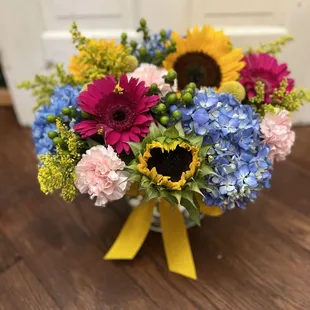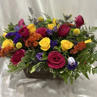 Floral arrangement Gerber daisy, roses, tulips, cremon and mixed greens