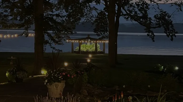 a view of a lake and a garden