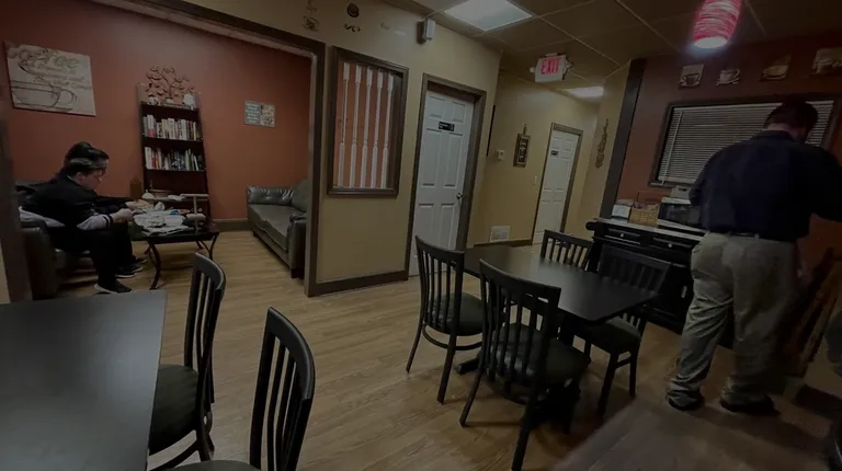 two people standing in a restaurant