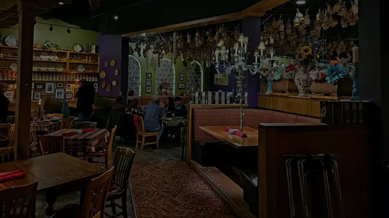 a restaurant with a large amount of food hanging from the ceiling