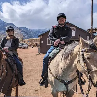 What an incredible experience!! I grew up riding, but hadn't ridden in about 20 years. My husband had been on a horse one time in the past. He suggested we look for a good trail ride here in the Springs. After doing a little research, the ratings for Academy Riding Stable & the tour of Garden of the Gods were the winning factors & we booked a 1 hour tour. ARS was super easy to get to & they had a decent sized parking area. We walked up to the check in window & provided our names. A very polite lady grabbed us helmets & advised us to have a seat around the corner. They have you step on the scale to confirm weight when you're headed into that area. What a view!!! As you're waiting for everyone to arrive, you cannot only soak in the sight of Pike's Peak, but you can also watch the wranglers feeding & prepping the horses for the day. We were introduced to one gentleman who was going to be assigning our horse for the day & another who would be leading our ride. We were advised of the process, the safety measures that needed to be taken & asked if there were any questions. Once the safety portion was finished, we were told our horse's name. My horse was Clyde, my husband got Martini. Each wrangler brought a horse out, called out the name & you met them at the mounting block. The wrangler who helped me was very friendly & helpful. She ensured my stirrups were long enough as well as even, advised me that Clyde was a "headbanger" & told me to have a great ride. There were 5 of us in the group & our leader was spectacular. He gave us historical points & explanations of different rock formations. It was also nice when he would give a heads up of an incline, decline, steps etc. in addition to how to comfortably navigate. The entire ride was scenic, peaceful & a great way to spend a spring morning. I was very pleased with Clyde. He was the perfect fit for me & this ride. My husband was also very happy with Martini & stated he felt at home on her. All in all, we were bummed it was over when the tour came to an end. I couldn't have hoped for a better experience & felt as though it was a very fluid operation. I would recommend ARS to anyone regardless of age & experience. We're already planning our next ride!!! Thank you ARS for making this one of the best days ever!!!