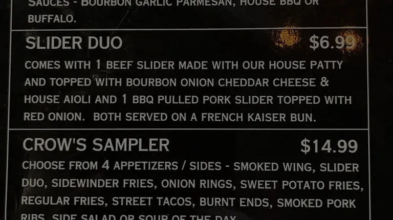 Heard of Buzzed Crow today and we've been looking for good places to go. I wanted so much to give them 5 stars so I did. Maybe they really deserve 4. The service was so friendly and fast. The Crows Nest drink sooo good. Even my husband got one after his Old Fashioned. The ambiance is perfectly casual and the singer, Cari Dell, phenomenal. My husband ordered the buzzed ap combo and loved it. I got the smoked brisket. That's where the star was almost lost. To was tasty but tough. Shouldn't it have fallen apart? Even with a knife it was hard to cut. Many options on the menu so we will be back to try more.