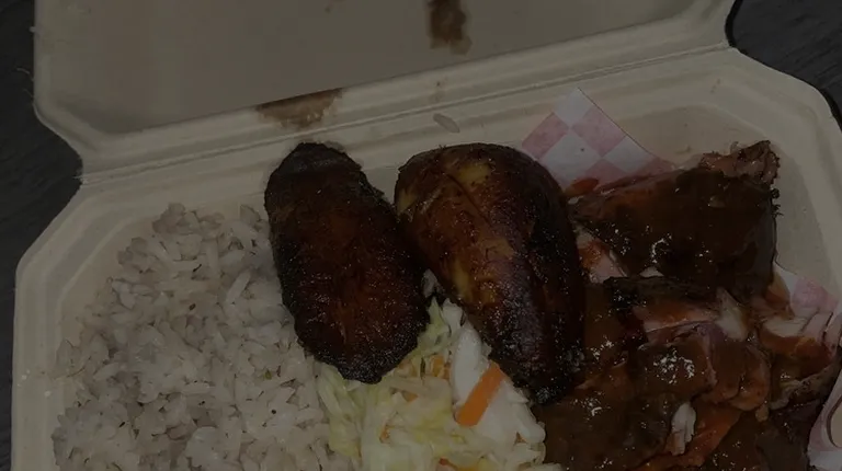 Jerk chicken and jerk ribs, cabbage, rice, plantains, and peas.