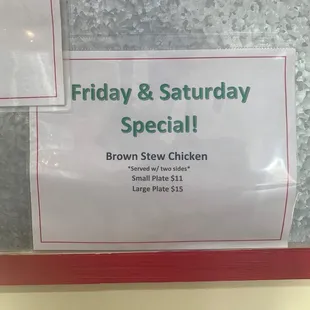Good stuff! All the standard Jamaican fare like Jerk Chicken, Oxtail, Goat, Beef/Chicken/Veggie Patties, etc. They even have Brown Stew Chicken on Fri and Saturdays! Just discovered these guys, so I've only tried the Goat and Oxtail, and I'll be headed over there Saturday to try the Brown Stew Chicken and Brown Stew Snapper! Everything I've had has been great. Nice people. Please, check these guys out and support them.