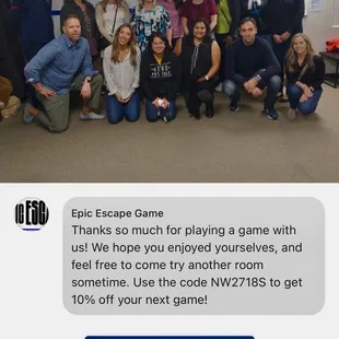 I really wanted my first escape room experience to be more fun, but no such luck. Epic Escape Games is upstairs in an old retail/office strip with lots of parking around the building. They also have a downtown location that may be kept up better. Alex welcomed us and was very nice and friendly. But everything we saw was old and worn, and in the 2nd room of our game, there was broken plastic on the floor from a broken ceiling light panel.Our game was the War for the Galaxy, and the premise was good. We were imprisoned in an enemy spaceship and had to get free, get to an escape pod, and flee the ship. They allow a maximum of 6 people, but the rooms were very small, and with 4 adults and 2 kids, we were bumping into each other with every step. This game had separate rooms and a screen where we could see our time and get messages and help. We also had a phone that we could use to ask questions and get help. It was disappointing that some of the flashlights that we needed to find clues weren't working. There was also a part where we needed to see something on the wall, but it was so faint we couldn't see it. An employee named JJ came to our room and told us that everyone else could read it and made us feel really stupid. He said he could see it but then had to get much closer and even then couldn't read all of it to us. He was extremely rude and is the main reason I won't be going back there. Robert was the person who came to get us when we got out. He took our picture at the end. He was kind.Hopefully, my next venue will be more fun.