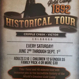 WOW!! This tour was so much fun and a great way to learn the history of Cripple Creek and Victor.The tour is 90 minutes long and covers Cripple Creek, Victor and the gold mine overlook. Along the tour local historical characters, in period dress, jump on and off the trolly giving a brief and often humorous short talk.This was a great deal for only $10. They also gave us free water LOL.