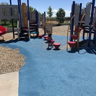Great park with a splash pad! Lots of parking, lots of shade and covered picnic tables. Bathroom and water fountain on site, playground has a mix of foam and wood chips. My 2 year old and 5 year old Both loved it, easy enough for the little one to climb around and enough variety for the 5 year old to stay busy.