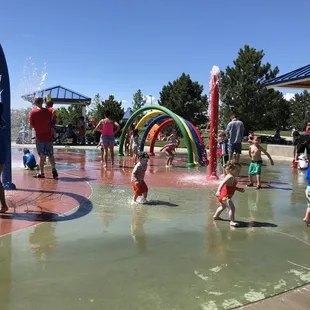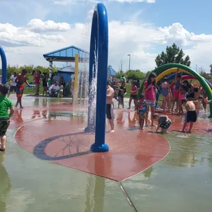 I adore this park because of the splash ground. Kudos to the city for running one. Weekends can get pretty crazy, but I find weekdays pretty manageable. There's always a chance that a school group is there, but it's still fun for the kids.There's a sizable playground too and the kids often go back and forth.The number one detriment is lack of bathrooms. There is one bathroom structure with one of those hole toilets and one Porta potty. There's often a line outside the toilets and there are no sinks to wash hands. This is typical for the average playground, but many splash pads as large as this would have better bathroom facilities.Otherwise, the park is well maintained. Not a ton of trash around and they come and fill holes with dirt.Also a baseball field and a huge open grassy area for other sports.
