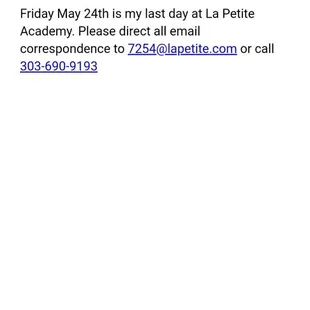 I have nothing but great things to say about this La Petite. My daughter who is 4 was in the pre-k class here. Unfortunately we had to move so she was only there for 4 months but you wouldn't believe how much she learned in the short amount of time. Ms.Kris and Ms.Melissa are very good at sending out recap emails of the children's progress each day so you know what to follow up on when your child is home from school. All of the staff is friendly and they made our transition here extremely easy. I would recommend this pre-k program to every and anybody! It's well worth it for your child to be ready for kindergarten!