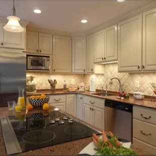 a kitchen with granite countertops and stainless steel appliances