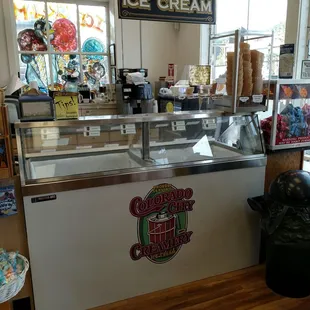 This place is like a mish mosh of emotions for me.Some touristy items, some cute items, priced for the neighborhood so a little high at times.They have everything from jewelry, clothing, pottery, and other gift like items. They also have fudge for sale at $15 a pound. Is that a good price? It seems kind of high to me but I don't have anything to compare it to. They have some really great ice cream at great prices. My mom and I both got a waffle cone with one scoop, honestly more like two scoops. $1.99 for each which is a steal in our opinion especially with the waffle cone. Mom had the cherry chocolate chip and I had the cookie dough (cult favorite). Both very tasty flavors and still hit the spot on a 30 degree day.