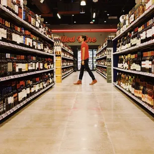 a wide aisle of wine bottles