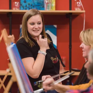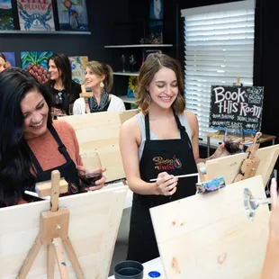 We had the best time here! Brittany was such a patient teacher and so sweet throughout the entire process. She definitely knew what she was doing and made the class really enjoyable from her direction on painting to organizing games during breaks. There were two other couples there which was a the perfect sized group and made it a really fun environment. Our paintings didn't turn out to be master pieces, but we definitely loved sipping wine while attempting the latter. You can purchase by the bottle or glass, they also have beer! Brittany was super tentative in making sure we had everything we needed whether it was a refill on wine or paint. Will totally recommend this to folks looking for a unique date night.
