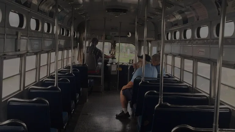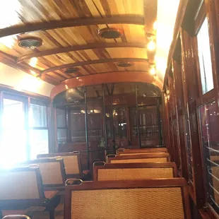 Inside an older street car that is being restored