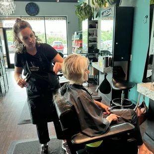 Great owners, very nice people. Expensive haircut. The young gal that cut my hair did a awful job. So disappointing. Was uneven. Had to cut one side myself just to make it the same. Hair in my face all the time. Have to clip it back. Which is why I wanted It cut. Didn't get what I asked for. I don't recommend going to anyone but the owners.