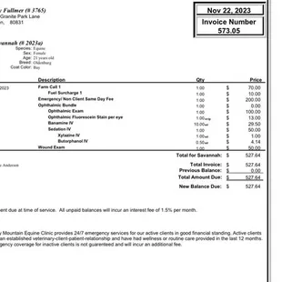 I called today for an emergency. My horse hit her eye and I do not mess around with eyeball issues. My normal vet is gone for the winter and all the recommended vets were full with emergencies. I called here and they "moved" emergencies around for my mares eye emergency. Well you cant be super picky in an emergency but I will NEVER use Dr. Anderson again. Charged me 200 for a non client fee? Well good thing we will never be a client. A money sucking vet has no interest in the animal. Told me I should use the in house dentist to pull my mares teeth because shes "old". Why would anyone do that? Her teeth are healthy. Demanded we redo her blood work that i did 60 days ago. On top of all that she charged me for a wound exam after she ripped a scab off my horse and claimed well that needs to be glued together. Don't worry she also charged me for the glue on the wound she created. "you must really love your horse" = you're a sucker and ill take you for every penny I can. Run for the hills and find a better vet. Invoice attached for proof.