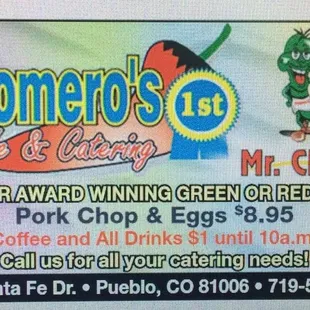 Romero's is one of the many Mexican/Southwestern style restaurants in Pueblo we haven't visited. So, we figured we should give it a try. We came early (we're old). There were only another couple in the place. Our server, a young woman, was pleasant and efficient. In the otherwise empty place, our order came almost instantly. It's clean and cheerful inside. A Mexican telenovella was playing muted on a TV screen. We ordered a specialty, the 'Rancho Grande'. It was a flat sopaipilla with meat, beans, cheese, tomatoes and onions. smothered in green chili. Lettuce topped it. The 'medium' chili was tasty, just the right hot. The serving was adequate, but not generous. My wife felt the meat was a bit sparse. In all, it was a competent dish. Romero's is, apparently famous for its burritos, particularly it's Monster Burrito. (I don't know if one gets a T-shirt for eating it) So, if one is looking for a decent local place, a bit out of the way, one should give Romero's a try.