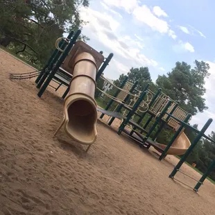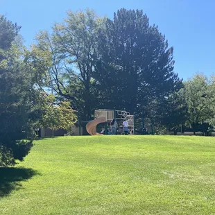 Nice neighborhood park. Lots of grassy area (mostly for soccer), a basketball court (close to the soccer fields), paved paths (for walking, jogging, kids riding bikes), a small sand-filled playground for little ones (ages 18 months- 5years old), and a swing set for 2 kids and 1 baby swing. There are mature trees (or maybe they are just overgrown pine trees) great for shade and a picnic, but beware, as some locals have told me that transients have been known to sleep/hang out under the shady trees.Other than that, a nice park for the young ones that need to get their wiggles out!