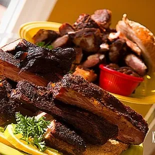 BBQ pulled pork shepherd's pie, mushroom and spinach pie, blackberry and peach pie