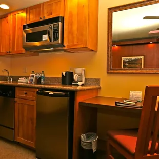 Kitchen/bar area. Full size fridge, microwave, stove and dishwasher.