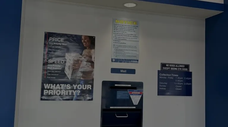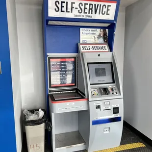 Self service today as it was too late for the post office hours. More kiosks are needed as the line became long for this one kiosk. Park on the side as not many parking spots in front of building.