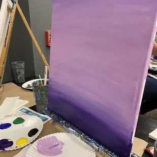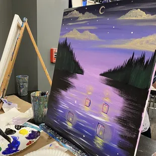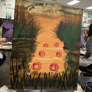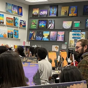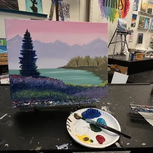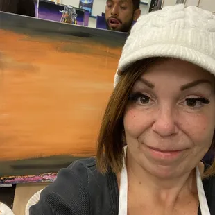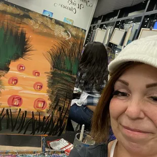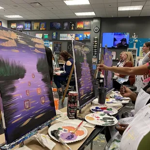 My first time painting and what a great time I had! Went with my Neice , sister in law and there two friends. We booked in advance because they get really busy and the classes get full quick. The instructors are amazing . Really so much fun and really easy to follow along with. Your able to buy alcoholic drinks as well as non alcoholic drinks as well as snacks to enjoy while you paint. They play great music while your painting so the vibe in the class is very upbeat. Definitely would go back again