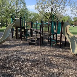 This is a cute neighborhood park with street parking. There's a nice green space with room for soccer fields and to run and play. There's a paved path, a basketball court, and an assortment of picnic tables and benches. There is also a shelterhouse with additional picnic tables located near the playground, which is good sized with slides, places to climb, a bouncy bridge, swings, and more. There is a wooded space along the edges of the park, which also adds some shade to the park.