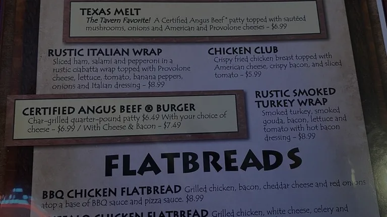 Great food. The Tavern cheese bacon burger was delicious and veggie flat bread was light and fresh , friendly and courteous service. Definitely recommend.