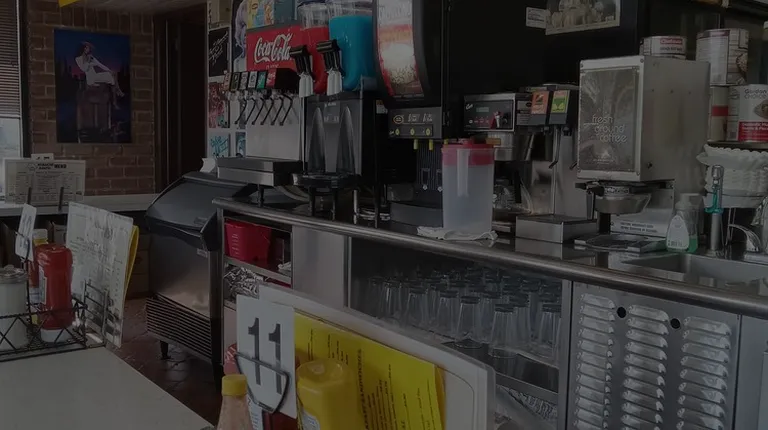Restaurant name/ in Golden donuts window