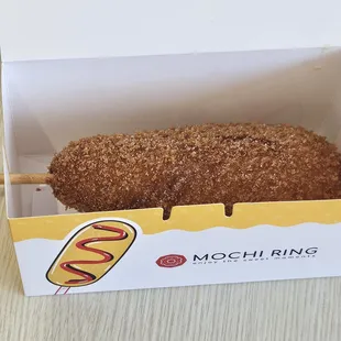 Oh, Mochi Ring.... Oh Mochi Ring...Why are you so delicious !!!!Seriously. I dont even like donuts. Its the texture of these rings that have me hooked. I guess they are made with rice somehow and wowzers, they are delicious. I purchased the taro ring and a peach sparkling lemonade with peach popping bubbles. I was in heaven. Would buy again Completely recommend. Please put one on the east side. Ps: they also have hotdogs and potato sticks. Yum