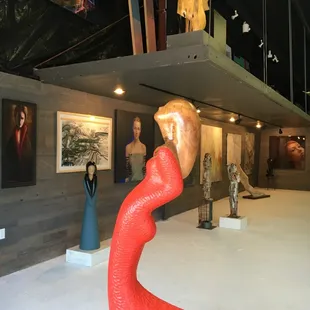 A Muse is one of the few galleries in Columbus that has a parking lot (and a bathroom). One star for that alone.I made my first trip there earlier this week. It seemed like a strange location, under a bridge, just across from the Parking Solutions office.This is definitely a female bent establishment. The themes were all about femininity and trees. The art was okay. It definitely wasn't bad, but I don't think it was all the way there yet. I didn't see one piece that I downright enjoyed or that drew on any kind of emotion. There was a piece with a girl and some eggplants. I thought that was skillfully done, and I contemplated the meaning for a while. It held my attention, but it's not something I would want to own. There were also some aviator statues with no arms, but, once again, they were just almost there.The gallery is large though, and it's very inviting. They seem to represent a lot of artists. They have two locations, and they just celebrated their 10 year anniversary. The curator was there, and she was helpful and friendly - almost too helpful and friendly. She asked us how we were doing three times. I wasn't sure if she was suspicious, if she wanted us to leave, or if she just thought we really looked like we needed help.My favorite part of A Muse was the shop dog, shadow. He looked like an aging Great Dane/Black Lab mix. There were two love birds in the office, literal love birds. They were very chirpy.If you go, be sure to go back to the office because there's more art for show back there.