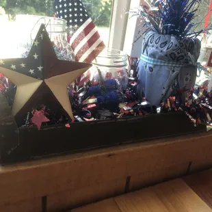 a patriotic display in a window