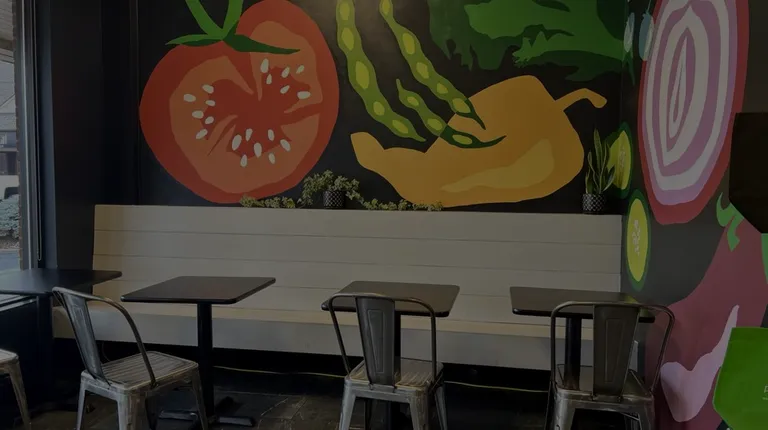 Cute seating section with 4 tables, chairs, and a colorful mural.