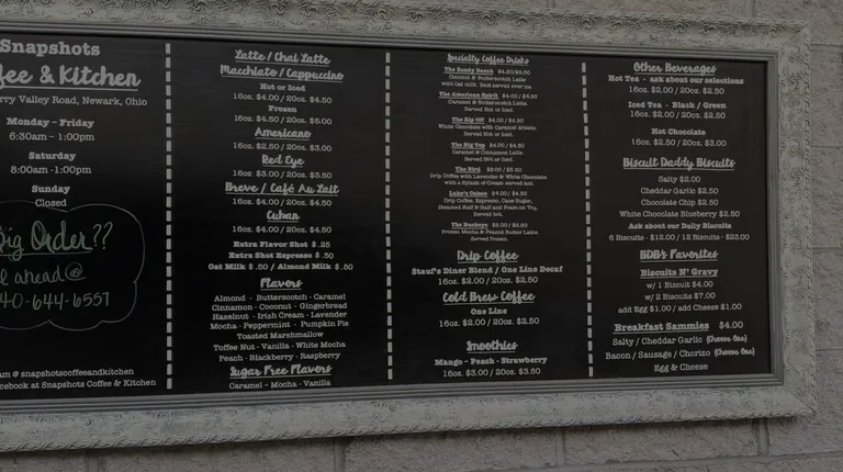 A very small eatery. Snapshot's Coffee & Kitchen does biscuits, and spiffy well! The fast-Casual eatery is small, but they've done a great job of adding decor and elements to make customers feel they can cop a squat and chill for a bit if they'd like. The order counter is small, but serves it purpose nice. The menu is small, but they do everything GOOD! How cute: patrons get a slice of fresh juicy watermelon to cleanse the palette and get you ready for the main show. I tried The Punch sandwich - homemade cheddar garlic biscuits, Ohio sourced chorizo patty, fresh local egg and cheddar cheese. Fantastic flavor. The sandwich has a very small spicy kick to it from the sausage. The biscuit was soft and not dry and crumbly.Got a vanilla hazelnut frozen mocha, and it was quite tasty also. More vanilla/hazelnut flavors than espresso, but that fits my personal preference; to eat their own. Sampled their strawberry biscuit hot out of the oven, and it was really good. Strawberry pieces all baked in, I'd suggest you give it a try. The owner Luke mentioned their Passion Fruit biscuit is quite popular, so I got one of those to go. Silverware? With every order comes a BIODEGRADABLE plastic pack with fork, spoon and napkin. Eco-conscious!! Prices match the end result perfect. Parking is very limited around the small building just because of its physical location, but there's additional parking in the bigger lot next door. There's only 8-10 spaces to sit inside. Well worth the drive. Will definitely be back!