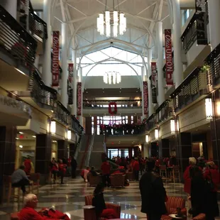 The first thing you notice in the Ohio Union is that it is not really possible to be confused about what university you are at. The sheer amount of scarlet, gray, Ohio/Block O, and buckeye decorations is jawdropping. This includes the bathrooms with their bright scarlet sinks and scarlet/gray tiling. There is also a cute Brutus Buckeye statue on a bench on the first floor, which is perfect for pictures.Buckeye pride and history is also exhibited throughout the building, with little museum-like displays. There is one area the features alumni and their contributions - who knew that the fellow involved in developing Drano was a Buckeye? There are a lot of neat stories in that area. Another exhibit is a series of doors. Behind each is the story of the union associated with the door, starting with the new one today and heading back to the time when there were two unions, one for men and one for women. There is also a lantern shaped tower, which is home to the Multicultural Center on the lower floor and to a beautiful, quiet study space/lounge with computers on top. The sign explains that the lantern was a deliberate construction, as the underground railroad went through here in a former building. There are many of these little signs for those interested in history or trivia. The art is also really neat. It also can be found throughout the building, on the walls and in little display cases. There are many nooks and crannies for studying or relaxing, and there are several services here including several dining locations and a coffee shop, a bank, and a store that features Buckeye themed, local, and Ohio products. Staff, faculty, students and alumni can find services including BuckID, Student Life, an alumni area, and a student leadership center. Event spaces are plentiful - there are many meeting rooms, a couple of ball rooms, a performance hall, a theater, and more. Parking is easily accessible in the two next door garages - just check the signage to see where you should park as a visitor or keycard holder.Beautiful building; well worth a visit for Buckeye fans!