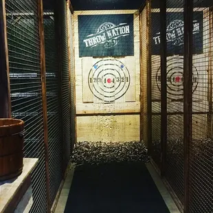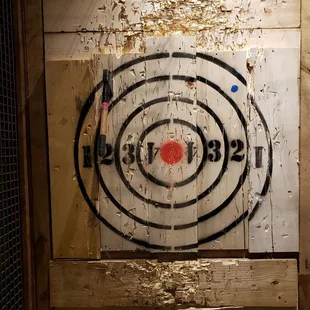 Came here at 2pm on a Sunday. No one else was there so we had the place to ourselves. It kind of took away from the ambiance but we had a good time. There was one person working who was super nice and got our drinks and checked in on us but otherwise left us to play. I wasn't a huge fan of their board or the closeness of the targets but we adjusted and had fun playing. You only get to throw the hatchet here unfortunately so no other fun things to play around with. We kept score with their laminated scoreboard.