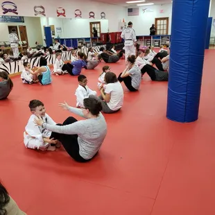 For months a friend of mine had been raving about this place....I'll admit - I was curious. This week my husband, daughter and I got to come in as guests for friends and family week for free.First thing is first, the space was perfectly set up for its purpose. The red mat floor was comfy and brightened the room. Changing spaces for men and women and clean bathrooms. There is a seperate space for waiting kids to play and chairs set up for parents or other visitors to watch.The class was challenging but not so much that it was hard to keep up with as new comers...so definitely come in a try it out. The most impressive part about the experience was the incredibly supportive staff and peers. We took an adult class seperate from the kids class but I hear they have family classes too. Sounds like they try to accommodate crazy schedules so no one misses any action!When we left, we were invited to return but no one pressured us to commit or shoved paperwork or anything in our faces - very comfortable setting.