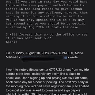 This is gonna be a in depth review of this business as observed while doing business with this establishment. 07/27/2023 Early morning between 8-9am i walkd in thru there sliding doors to inquire about a membership from the tall caucasian male behind the counter. i was given a tour as well as a fee chart for services. Upon feeling that Victory fitness would be a good gym to join i paid $95.66 and became a member all in the span of 30 minutes. Upon payment and signup i left to gather some gym clothing. A hour later i came back to work out. the day went by no issues now the next day 7/28/2023 early morning i called in due to getting a call regarding a serious family matter which would require me to relocate immediately. The same gentleman notified me that i would have to go to sign paperwork and also confirm the cancellation which i did within a 1 hour. i payed with apple pay due to not having my physical card. before leaving victory fitness the caucasian gentleman notified me it may take up to 30 days to process my refund which i accepted. it is now 8/28/2023 No Refund and no response on status.