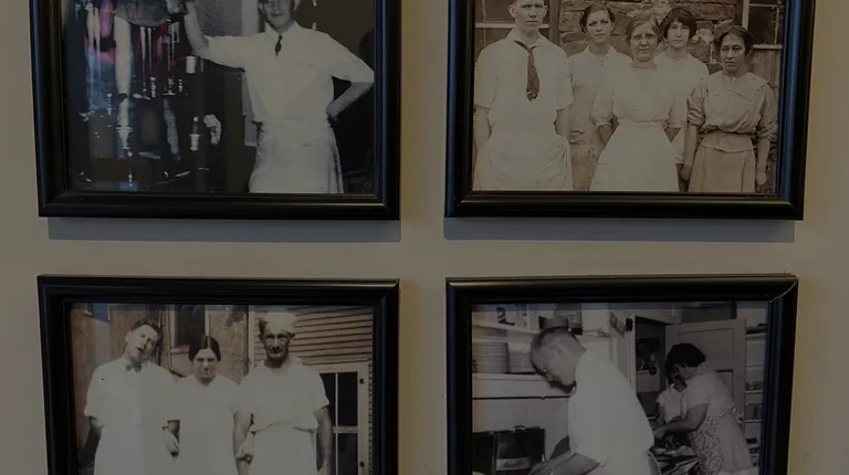 a group of framed photos of the restaurant