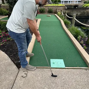 Fun , light hearted mini-golf course that's perfect on a summer day! After dinner tonight, fresh air and a fun activity sounded perfect to wrap up the evening. The mini golf course is easy going, we'll landscaped and a cheap activity for date night. The only downside is that all of the water features were turned off leaving stagnant water and us wondering if it's going to be over run with mosquitos before too long. Maybe it was a fluke after the storms though.