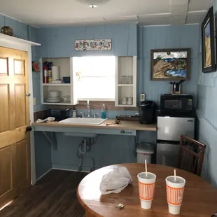 Glassware, plate-ware and utensils. Fridge with ice trays. Perfectly comfortable chair for relaxing.