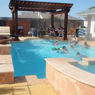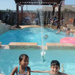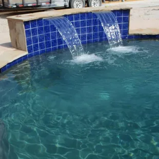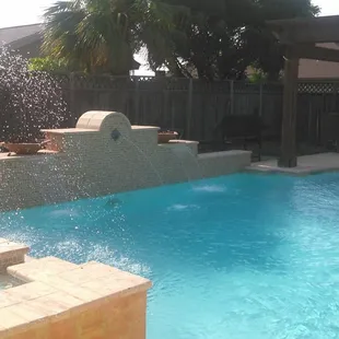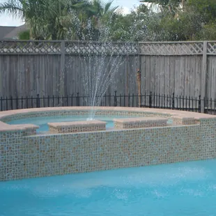 Pool and spa with elevated walls, fountain, and fire bowl accents.