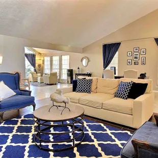I love my living room! It has a vaulted ceiling, brick fireplace, and a built in shelf.