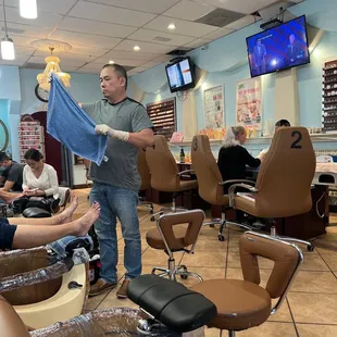 Dang how Unrelaxing of a foot pedicure. The guy coughed the ENTIRE time. Seriously if your sick and think people want you touching them after non stop coughing, the manager needs to re-evaluate. I wanted to get nails done too but will pass and drive down the street as soon as I'm finished. It was as painful as having an eyelash tech cough and sniff over your face for an hour