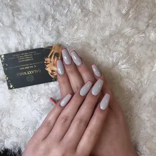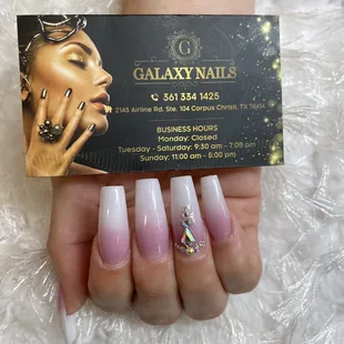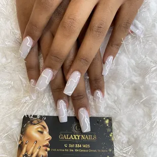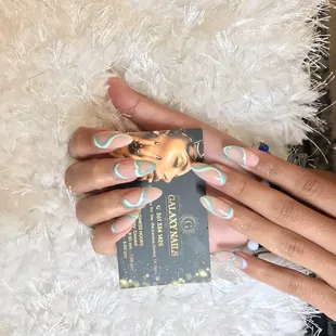 I went to get my nails done and told them I either wanted white or french tip, I'm not particular at all! The nail tech then comes back and shows me a picture that looked identical to these, I said sure if you're up for it let's do it! She really outdid herself and was so kind to look up something fun to do. Love this place and the service!