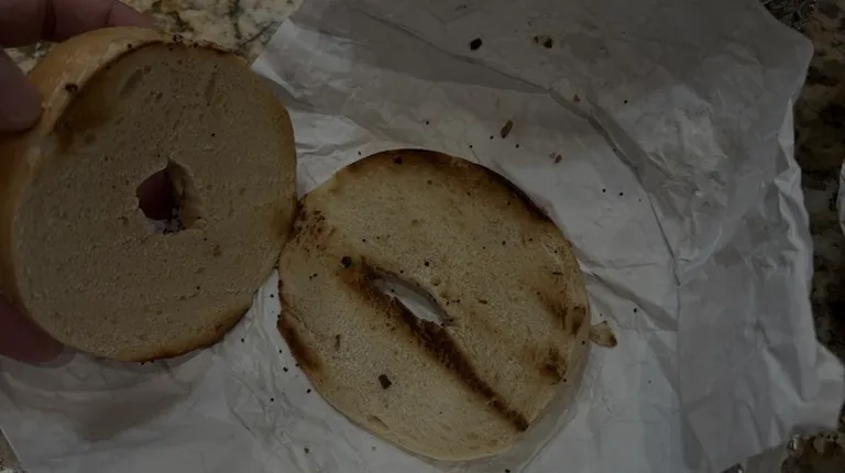 A mediocre attempt at a bagel with bacon and supposed to have cream cheese on it.