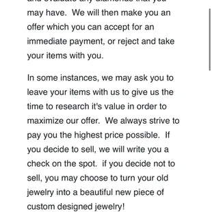 Wanted to see about selling a piece of jewelry at Green Bros as I had a wonderful experience with them a few months ago when I got my ring resized. Went and was told they don't buy and only take jewelry for "scrap metal" even though it says otherwise on their website. (As you can see at the bottom, it says Copyrighted 2024, so it's not as if it hasn't been updated in a long time). Staff was still really nice, I just think updates should be made to their website to keep from confusing customers.