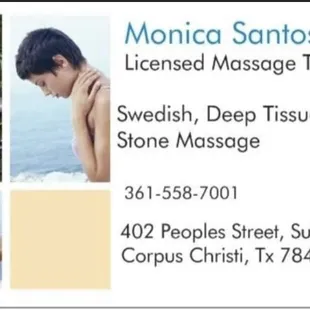 Hello I'm Monica Santos, Licensed Massage Therapist. Schedule your massage appointment Today!