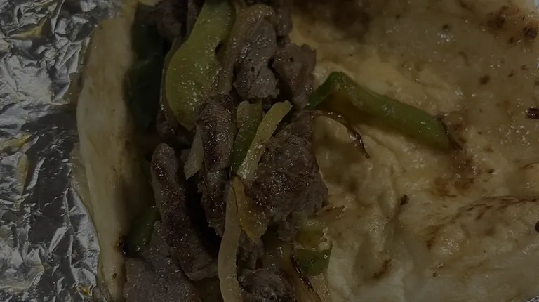 a taco with meat, onions, and avocado
